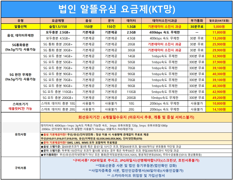 정상적인 사업을 위해 대량유심(20개이상~수천개) 이 필요한경우는 , 해당 KT망이 아닌 다른 알뜰통신사에서 증설이 가능하지만. 하단에 있는 요금제가 아닌,해당요금제보다 30~50%정도 비싼요금제 NEW요금제 설계후 진행도 가능합니다. 그럴경우, 정상적인 사업 인지가 가장 중요하고. 미팅을 통해 유심 증설이 필요한 사업을 확인뒤 진행이 가능하오니. 대량유심일경우 따로 문의 바랍니다.